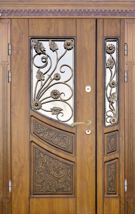 Поскольку в большинстве случаев устанавливаемые на входе в коттедж двустворчатые двери являются еще и предметом интерьера, украшающим здание, их дизайну предается особое значение. Эти двери, как правило, отделываются атмосферостойким МДФ, натуральным шпоном, массивом. Эффектно на таких дверях смотрится витражный узор, применение ковки, зеркальных элементов. Вариантов декора входной двустворчатой двери масса, тут все зависит от пожеланий заказчика.